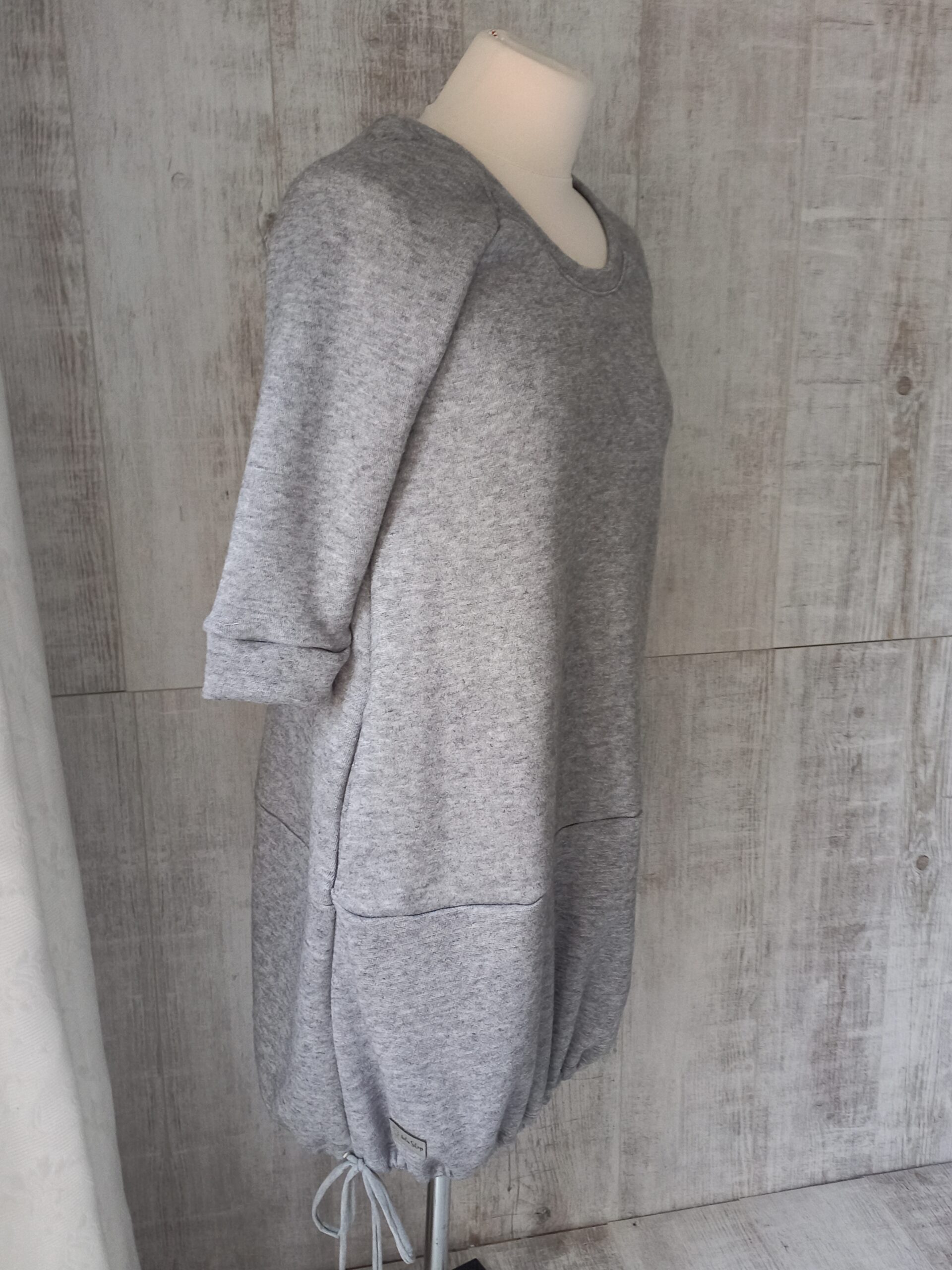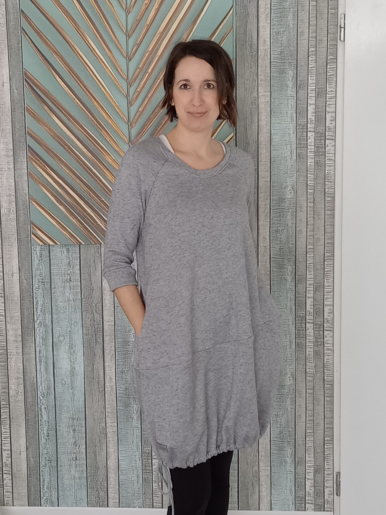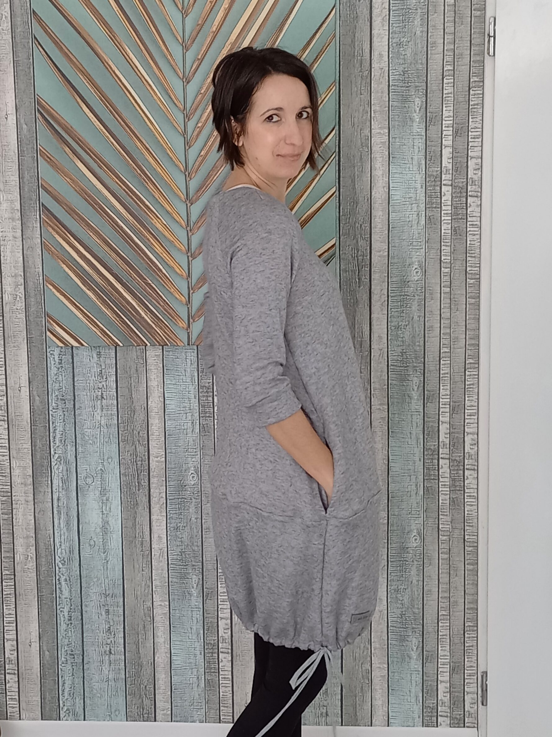 Csínos, bő fazonú női ruha szürke kötött anyagból. Szabása miatt minden alkatra tökéletesen illik. Kényelmes viselet tavasszal, ősszel, és télen is. Oldalt, csípőnél nagy zsebei vannak.