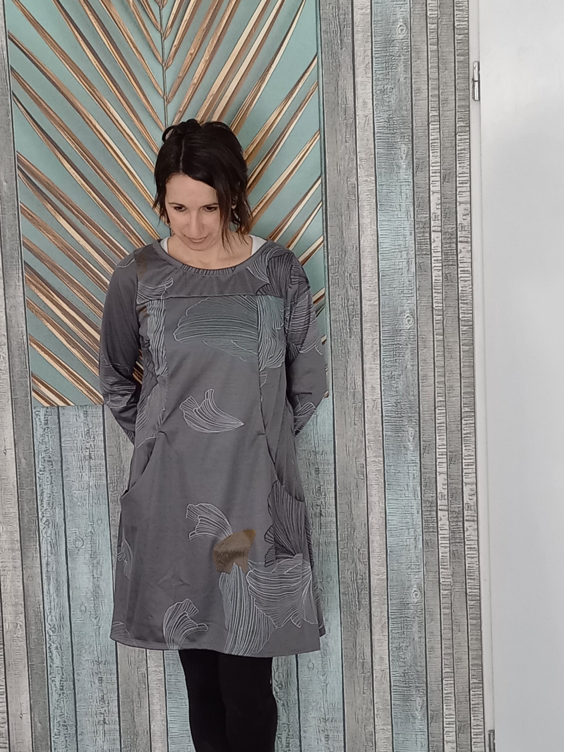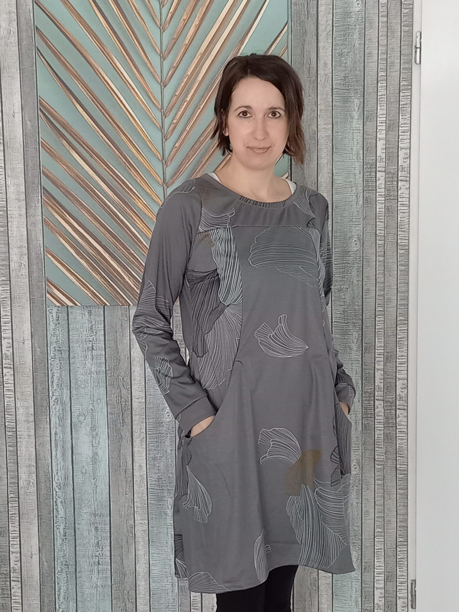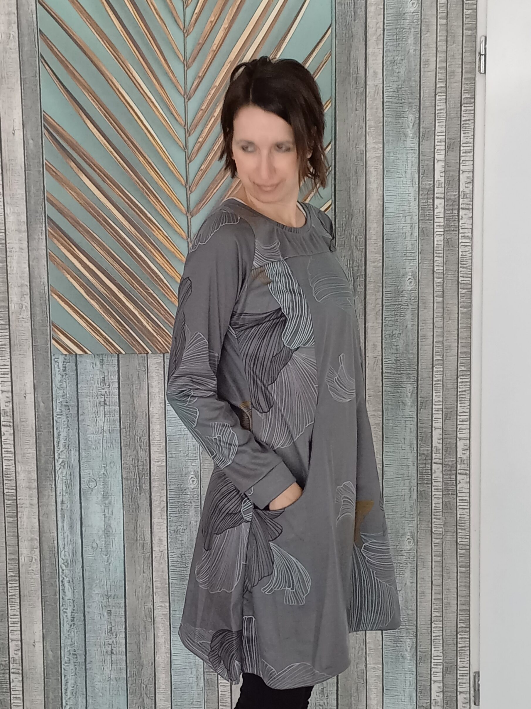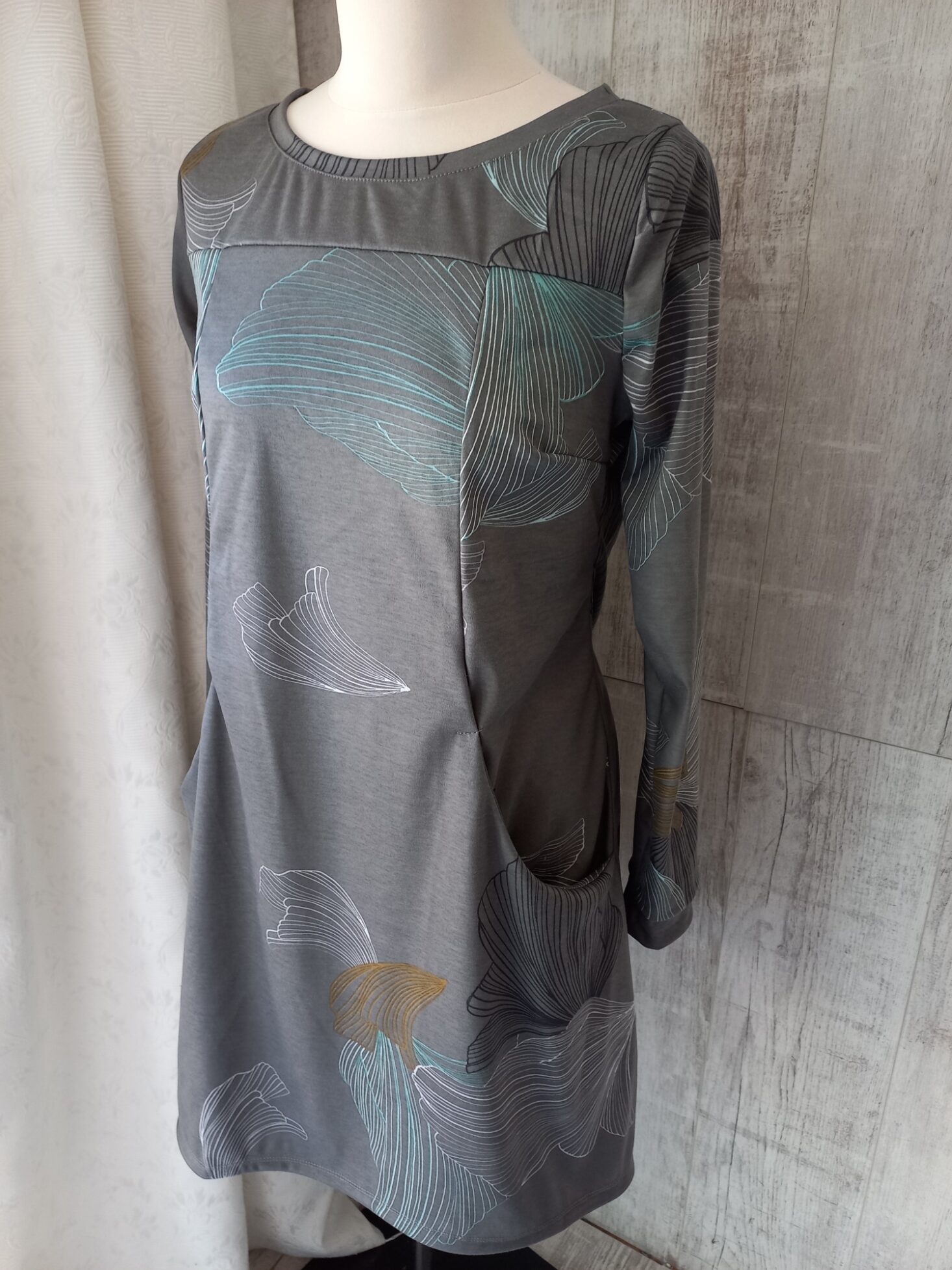 Szürke, türkiz levélmintás A vonalú női ruha. Oldalt nagy zsebekkel.