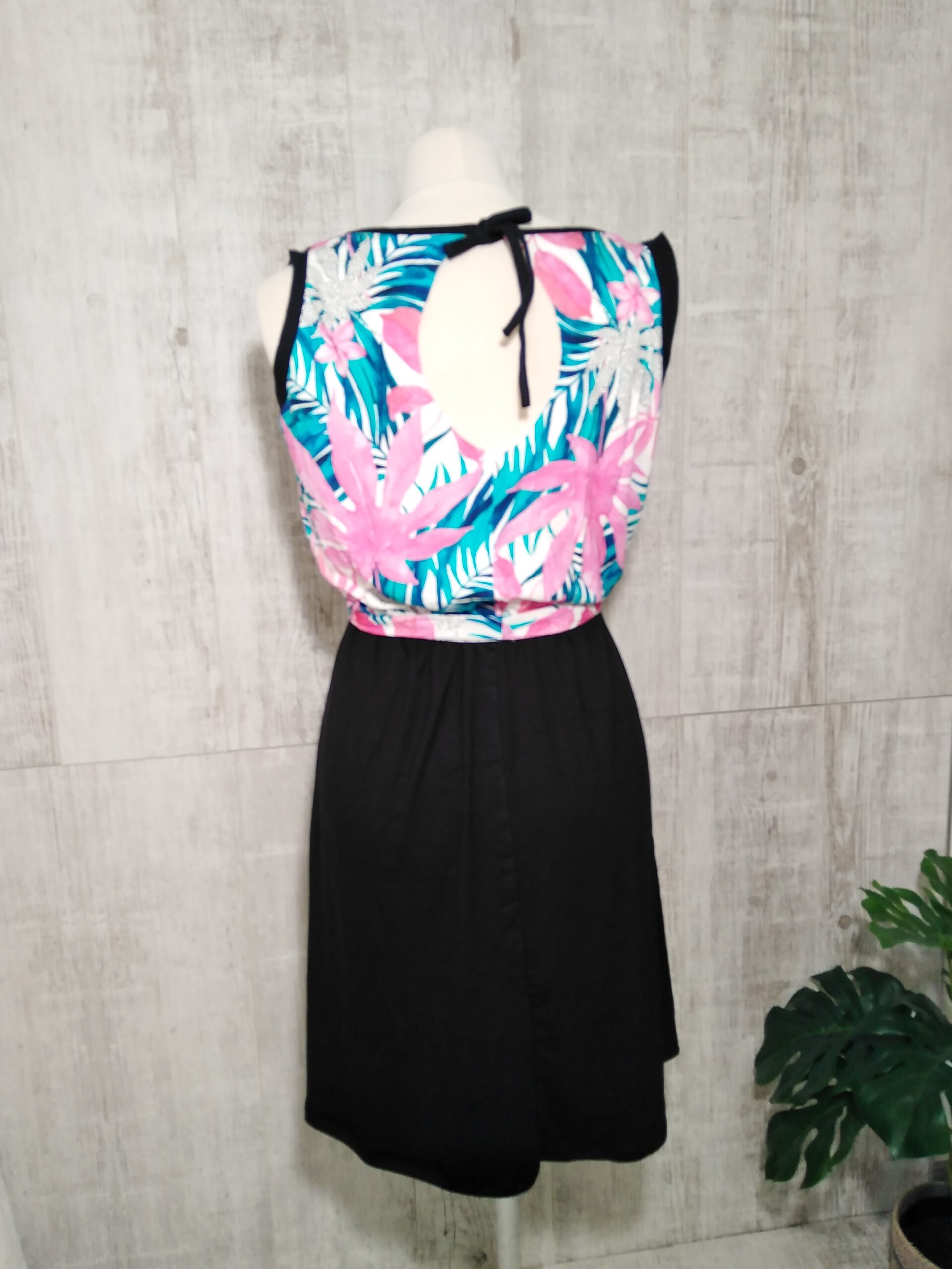 Pink, türkiz levélmintás női ruha. A szoknya része fekete viscose jersey. Háta kivágott. Kör nyakkivágású, akár szoptatni is lehet benne. Derékon öv díszíti.